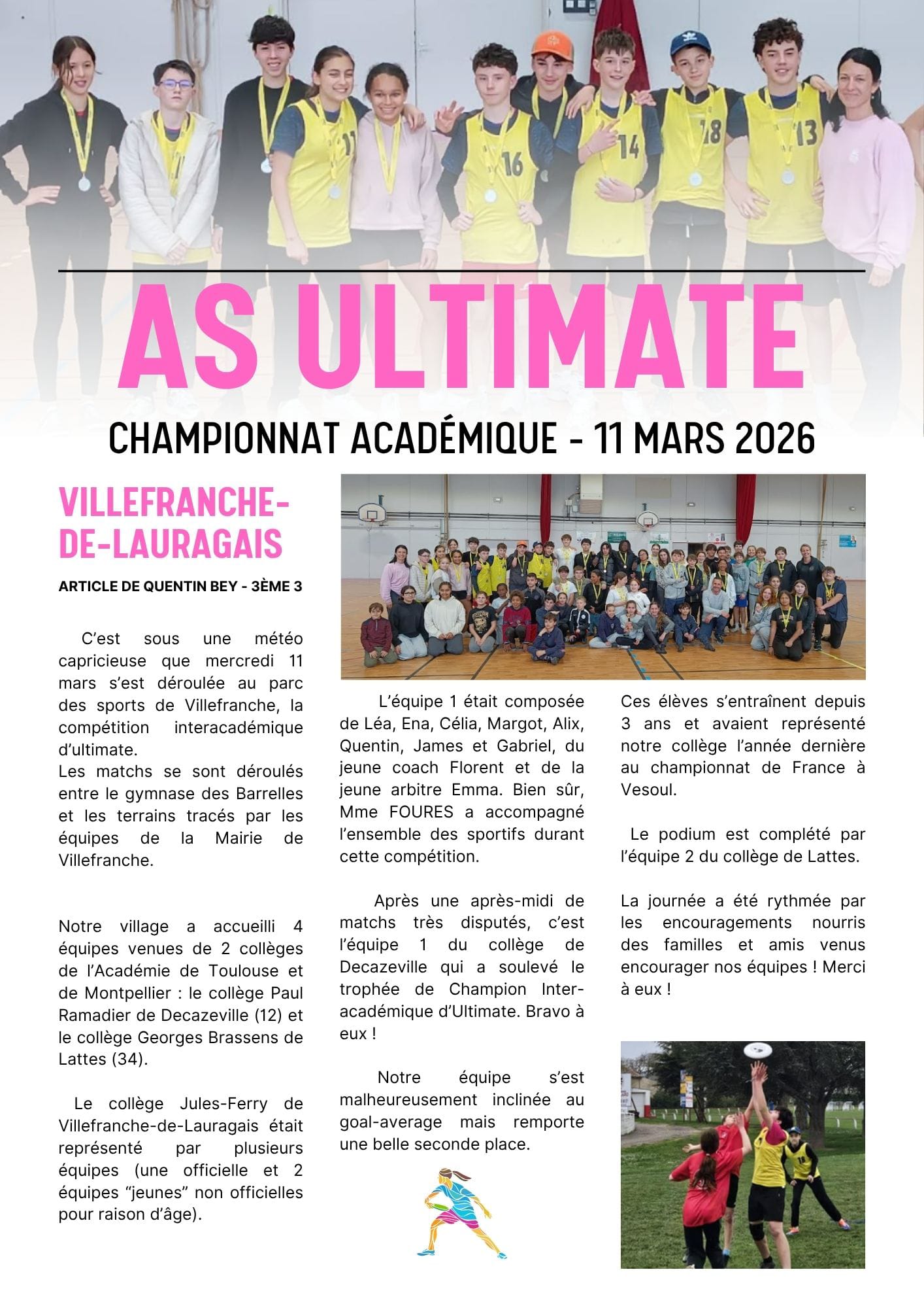 A l'occasion du Championnat Inter-Académique d'Ultimate organisé par le collège Jules Ferry en Mars, les élèves de l'AS Ultimate se sont hissés à la 2ème marche du podium. Nous félicitons l'ensemble des élèves! (Article en PJ du capitaine Quentin)